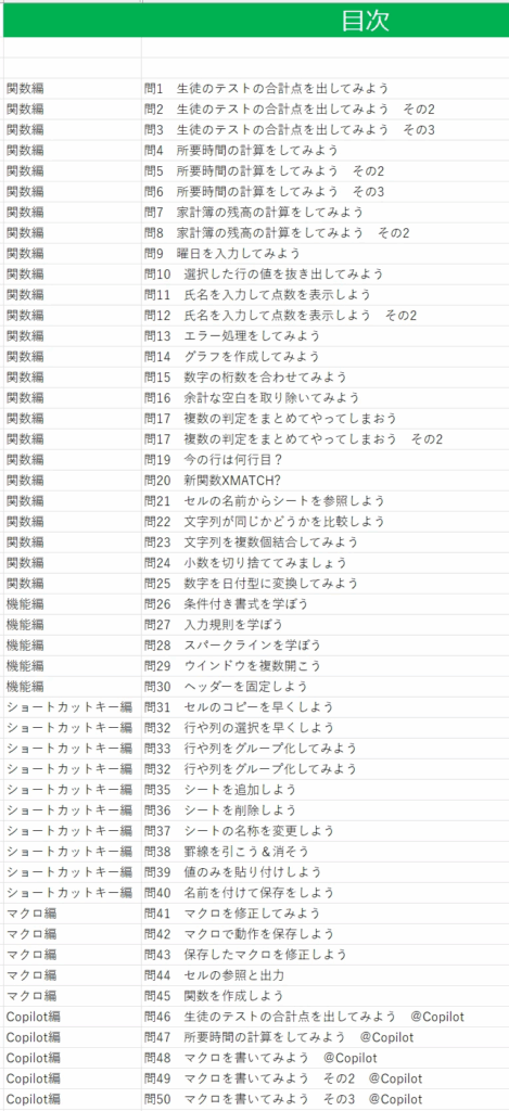 今回ご紹介する問題集は、関数編、ショートカットキー編、マクロ編、Copilot編に分かれた全50問です。動画での解説もついており、自分のペースで学ぶことができます